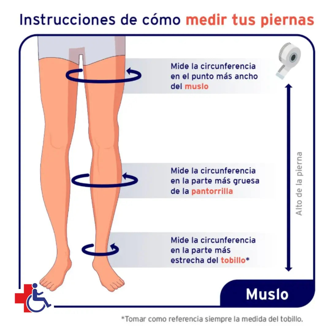 Para una correcta medición, las piernas deben estar descansadas, puede sentarse con las piernas en alto o acostarse para una mejor medición. Para prendas al muslo, debe medirse el tobillo, pantorrilla y muslo, pero tomando como principal referencia la medida del tobillo: